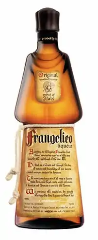 Frangelico (Italian: [franˈdʒɛliko]) is a brand of noisette (flavored with hazelnuts) and herb-flavored liqueur coloured with caramel coloring, which is produced in Canale, Italy.[1] It is 20% alcohol by volume (ABV) or 40 proof. Formerly, it was 24% ABV or 48 proof. When produced by the Barbaro family it was bottled at 28% ABV or 56 proof. The brand was created in 1978.[2] It is known for its unusual packaging; its bottle was designed to look like a Christian friar, complete with a knotted white cord around the waist. It is most commonly sold in two sizes: 750ml and 375ml.