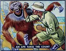 In late summer 1915 an "enormous orangutan" came from Java on a Russian tramp steamer otherwise loaded with sugar. Robison bought the steamer's animal cargo and rapidly sold the constrictor snake to a circus, but could not seem to find a buyer for the orangutan. Buck told him that at the Exposition Zone there was a "fast-talking carnival man named Don Carlos, whose concession was doing badly." Apparently Don Carlos[lower-alpha 1] "had no money", but Buck suggested Robison let Don Carlos use the orangutan on a percentage basis until the end of the exposition "in a few weeks". According to Robison, the orangutan "was a sensation. Within two weeks Carlos brought in $750 as full payment for it, plus $500 as the pet shop's percentage of the receipts."[6]