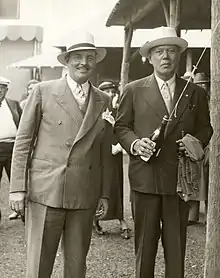 As the Oakland Tribune put it, Buck went on to fame as the "dashing, dauntless, devil-may-care hero of the big game world".[5] By the 1940s, Frank Buck claimed to have captured 49 elephants, 60 tigers, 63 leopards, 20 hyenas, 52 orangutans, 100 gibbons, 20 tapirs, 120 Asiatic antelope and deer, 9 pigmy water buffalo, a pair of gaurs, 5 babirusa, 18 African antelope, 40 wild goats and sheep, 11 camels, 2 giraffes, 40 kangaroos and wallabies, 5 Indian rhinoceros, 60 bears, 90 pythons, 10 king cobras, 25 giant monitor lizards, 15 crocodiles, more than 500 different species of other mammals, and more than 100,000 wild birds. Sultan Ibrahim of Johor was a good friend of Buck's and frequently assisted him in his animal collecting endeavors.[21]