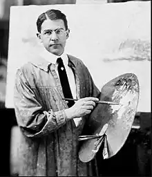 Schoonover became part of what would be known as the Brandywine School when he opted to study art rather than the ministry.[4] A prolific contributor to books and magazines during the early twentieth century, the so-called "Golden Age of Illustration", he illustrated stories as diverse as Clarence Mulford's Hopalong Cassidy stories and Edgar Rice Burroughs's A Princess of Mars. In 1918 and 1919, he produced a series of paintings along with Gayle Porter Hoskins illustrating the American forces in the First World War for a series of souvenir prints published in the Ladies Home Journal. Over the course of his career, he made more than 5,000 paintings, many of which were influenced by his travels and the people he met.[2][5]