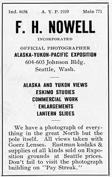 - ↑ Ad for photographer Frank H. Nowell in the official program of the Alaska-Yukon-Pacific Exposition. 1909. p. 92.