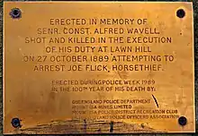 An escaped prisoner named Joe Flick nearly ended Hann's life in 1889. Flick was hiding in Hann's Lawn Hill homestead after fatally shooting a policeman (Alfred Wavell), when Hann confronted him upon returning home. The intruder agreed to converse with Hann but instead shot him in the chest at close range. Hann survived, but Flick was cornered and shot dead by other police in the early hours next morning.[3]