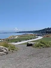 The Dune Peninsula at Point Defiance Park in Tacoma, Washington, with Mount Rainier in the distance