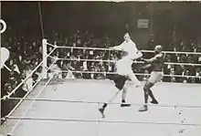 While Moran was serving in the U.S. Navy in 1908, he knocked out fighter Fred Cooley in the second round. While serving on the U.S.S. Mayflower, he served as a spar partner for President Theodore Roosevelt. He began his career as a prize-fighter that same year with a match against Fred Broad. Soon, Moran, who had a hard right hand punch which he called "Mary Ann", became known as the "White Hope" of the teens. In 1914 he fought Jack Johnson for the Heavyweight Championship of the World, and in 1916 "The Fighting Dentist" went up against Jess Willard for the same title, but lost both bouts. He lost his last fight to Marcel Nilles for the Heavyweight Championship of France on December 22, 1922. He retired from boxing after 66 bouts with a record of 36 wins (28 by a knockout), 13 losses, 16 draws and 1 no contest.[2]