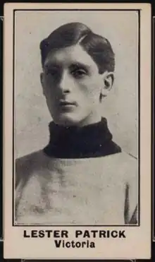 Patrick's father, Joe, was the son of Irish immigrants: Thomas Patrick had emigrated from County Tyrone in Ireland to Canada in 1848 and settled in Quebec. Joe was born in 1857 and in 1883 married Grace Nelson. They moved to Drummondville, Quebec, where Joe worked as a general store clerk and Grace was a schoolmarm.[1] Drummondville was predominantly French-speaking and Catholic at the time, making the Anglophone and Methodist Patrick family a minority in the town.[2] Patrick was born on December 21, 1885, in Ottawa, Ontario, the second son of Joe and Grace Patrick.[lower-alpha 1] It is not clear why he was born in Ottawa, which was roughly a five-hour train ride from Drummondville at the time; biographer Eric Whitehead suggested Grace likely needed some specialized care for the birth as the reason for the relocation.[4] In 1887 the family moved 9 miles (14 km) to Carmell Hill, where Joe bought a half-interest in a general store with William Mitchell.[lower-alpha 2] As in Drummondville the town was mainly Francophone, leading the family to learn French.[2] Joe and his partners sold their store in 1892, earning a substantial profit of $10,000; Joe used his $5,000 to establish a lumber company and built a mill in Daveluyville, which was 60 miles (97 km) west of Quebec City.[6] That winter Patrick and his older brother Lester received their first pair of skates.[5] In 1893 the family moved again, this time to Montreal, as Joe expanded his lumber company. They first lived in Pointe-Saint-Charles, a rail district, before moving to the more prosperous suburb of Westmount in 1895.[7] While in Montreal the two older Patrick brothers were first introduced to ice hockey.[8] Patrick attended Stanstead College, a prep school, where he played both hockey and football.[9] They also met Art Ross at this time, who became a close friend of both brothers and had an extensive career in hockey.[10]