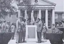 On 20 July 1917,[3] in accordance with the standard procedure of naming aviation fields for those servicemembers who died "during the 'experimental' era" of aviation, Scott Field was named for the first American enlisted man to die in an aircraft accident.[2] With Chief Master Sergeant of the Air Force Thomas N. Barnes as the guest of honor on 20 July 1976, a granite-and-bronze memorial was dedicated to Corporal Scott at the Air Force base named for him.[5] As of May 2017, Scott Air Force Base was the only United States Air Force base named for an enlisted person.[6]