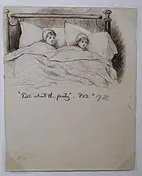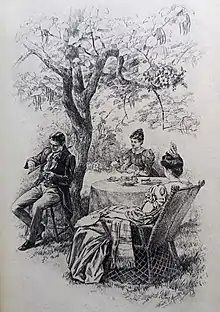 Merrill's first major commission was to illustrate a new edition of Little Women.[10] Originally released in two volumes in 1868 and 1869, a single-volume revised edition was published in 1880 to capitalize on the book's popularity and to deter copyright violators.[11] Merrill created over two hundred pen-and-ink drawings for the new edition.