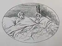 In 1914, Merrill appeared as a witness in a case of "larceny and conspiracy" regarding the sale of a collection of books.[23] When asked his opinion of the illustrations in one of the books, he replied, "It's not a very gracious thing for one artist to criticize another but as I see this I will say it doesn't appeal to me". Merrill also stated that he was paid "a little in excess of $1,900" for illustrations made for editions of the collected works of Keats and Shelley, which were among the books involved in the lawsuit. He added that he was paid $60 for each of four drawings for books by Mark Twain, probably referring to a commission for four full-page illustrations for a new edition of The Prince and the Pauper which was published in 1899.[24]