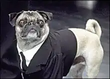 Frank the Pug is a fictional character from the Men in Black franchise, first seen in the 1997 film.[1] He has also appeared in the 2002 sequel, 2019 spin-off, the animated series and the video game MIB: Alien Crisis. Within the films, Frank has the appearance of a normal pug dog, but he is actually an extraterrestrial in disguise (a Remoolian).[2] Frank is played in the first two films by a trained pug named Mushu,[3] with Tim Blaney providing his voice in the films and the video game. In the animated series, the voice is provided by Eddie Barth. Mushu was raised by Ted Brac, who trained him for all his acting roles.