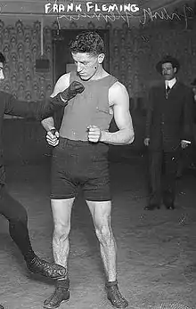 Frank "Frankie" Fleming (1893-1960) was a Canadian featherweight boxer active from 1910 to 1922.[1] During his career he held the distinction of being the Canadian Boxing Federation Featherweight Champion.[2] He is best known for beating all-time great Benny Leonard twice, being the only fighter to do so. He also faced Hall of Famers Johnny Kilbane, Johnny Dundee, and Freddie Welsh in defeat; challenging for the latter's World Featherweight Title. Statistical boxing website BoxRec rates Fleming as the 11th best Canadian boxer ever across all weight divisions.[3]