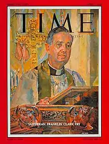 Nonetheless, during his time as president, Fry became known among many church leaders as "Mr. Protestant", a moniker that captured his tireless work on behalf of greater unity among Protestant church bodies and made famous by the cover story on Fry in Time magazine in 1958.[4] Seeing it as his mission to heal the Christian church's fragmentation into numerous splinter groups, Fry was a prime mover behind the formation of the Lutheran World Federation in 1947, the World Council of Churches in 1948, and the National Council of Churches in 1950. Among his many activities with these groups, Fry presided over the constituting convention of the National Council of Churches, and he headed the policy-making central committee of the World Council of Churches. He described the World Council as a means to "hold Christianity together, to keep the means of communication open, to keep conversation going even if there is no success in our lifetime." Fry also became president of the 72-million-member Lutheran World Federation in 1957.