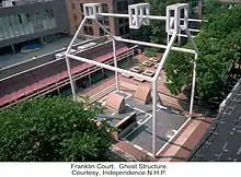 Most notable are the two "ghost structures" made of square tubular steel, recreating and suggesting the outline of the long-demolished buildings within the courtyard. The design resulted from inadequate historical information to properly reconstruct the structures, couple with emerging philosophical views at the time towards reconstruction of structures.[2][3] The design concept has since been emulated at other historic sites. Ten years after their construction, in 1986, the National Park Service specifically noted that the "ghost structures" should be evaluated upon reaching the 50-year limit for the National Register of Historic Places, and were listed as "non-historic, contributing."[1] According to the National Register nomination, the larger frame, depicting the Franklin House, is 49'5" x 33', by 50'6" tall at the crest of the roof, while the smaller frame, depicting the Print Shop, measures 48' by 20', with 48 feet to the crest of the roof.[1] Pavement changes demarcate the arrangement of rooms, and concrete hoods permit visitors to look down to the archaeological remains beneath.[1]