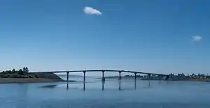 The Franklin Delano Roosevelt Memorial Bridge is an international bridge which connects the community of Lubec, Maine[1] in the United States with Campobello Island in the Canadian province of New Brunswick across the Lubec Narrows. The decked steel beam bridge is named for Franklin D. Roosevelt, the 32nd President of the United States, who maintained a summer retreat on Campobello Island (now preserved as Roosevelt Campobello International Park). A plaque in the middle of the bridge is the easternmost physical marker of the Canada–United States border.[2]