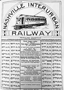 The Franklin Interurban Railway, also known as the Nashville Interurban, was an electric interurban rail line that existed in central Tennessee between 1908 and 1942. It ran between Franklin, Tennessee and Nashville, a distance of about 20 miles (32 km). The train left hourly from 7 a.m. to 11:30 p.m. carrying passengers and freight between the two cities. There were 20 stations listed on line, but passengers could flag down the train at any point to board. Boarded passengers could pull a brake cord to be let off anywhere along the line.[1]