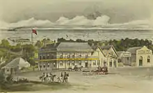 James Davey arrived in the Frankston area in 1840, gaining a 640 acre pre-emptive right to land license over what are now the suburbs of Frankston and Frankston South from Olivers Hill south to Daveys Bay.[3][44] Davey built the Cannanuke Inn in the mid-1840s, which was the first permanent building in the Frankston area,[3][24] and was located on the site of the present Frankston Mechanics' Institute at 1 Plowman Place in the Frankston Central Business District (CBD).[25] He built the first permanent wooden house in the southern Frankston area located near Daveys Bay on Olivers Hill in 1851—which was originally known as "Old Man Davey's Hill".[45][46]