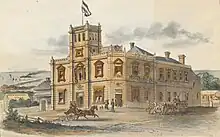 The pub to which Charlwood refers was originally named the Cannanuke Inn and was the first permanent building in the Frankston area.[5] It was built by the pre-emptive Frankston settler James Davey in the 1840s.[3][5] The Victorian Heritage Database states that it was located on the present site of the Frankston Mechanics' Institute; at 1 Plowman Place in the Frankston Central Business District (CBD).[24][25] According to Charlwood, it was purchased by a "Mr. Stone" in the early-1850s who, after the birth of his son, "Frank", renamed it "Frank Stone's Hotel" and around which the village developed and also had its name adapted from for its formal land sales in 1854.[23]
