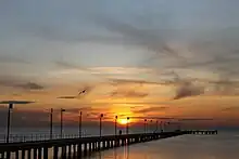 Frankston's fishing industry was further developed with the assistance of Thomas McComb, who funded the construction of Frankston Pier in 1857.[3][46][64] Following a petition by residents, to the Victorian colonial Department of Public Works, the pier was extended into deeper water in 1863.[46][64] A gaslamp was installed at the end of the pier and a lamplighter was also employed.[46] Frankston Fish Company was founded in 1867, by a consortium of local businessmen including Thomas Ritchie,[65] in order to transport the catches of local fishermen in bulk to the fish markets of the Melbourne city centre.[46]