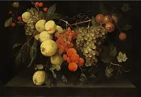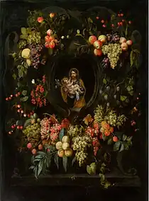 Van Everbroeck collaborated on garland paintings with other painters, but it is not recorded who were his collaborators. The collaborators painted the figure or figures inside the cartouche while van Everbroeck painted the fruit garland. An example is the Garland of fruit surrounding St Joseph with the Child Jesus (1667, at Hampel Fine Art Auctions on 27 March 2009 in Munich, lot 280). The artist has included a beetle on the stone ledge and a butterfly on the left side among the fruit in the garland. Van Everbroeck rendered the fruits in a luminescent and naturalistic manner, with a pronounced depth.[8] Another example of his production in this genre is A cartouche still life of flowers and fruit around a portrait of a lady dressed as a shepherdess (At Sotheby's on 3 May 2017 in London, lot 138).[9]