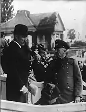 He married Martha von Boch-Galhau (1880–1961) on 3 May 1905. Papen's wife was the daughter of a wealthy Saarland industrialist whose dowry made him a very rich man.[3] An excellent horseman and a man of much charm, Papen cut a dashing figure and during this time, befriended Kurt von Schleicher.[3] Papen was proud of his family's having been granted hereditary rights since 1298 to mine brine salt at Werl. He always believed in the superiority of the aristocracy over commoners.[4] Fluent in both French and English, he travelled widely all over Europe, the Middle East and North America.[3] He was devoted to Kaiser Wilhelm II.[5] Influenced by the books of General Friedrich von Bernhardi, Papen was a militarist throughout his life.[5]