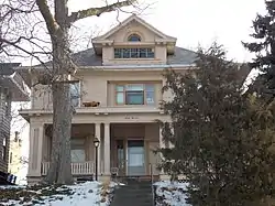 Davenport architect Dietrich J. Harfst designed this two-story house in the Georgian Revival style. It sits high above Main Street as it climbs the bluff above the downtown area. It is also one of the few of Harfst's projects to remain in Davenport, which is primarily why it is significant.[2] Otherwise, it is a fairly typical hipped box style house. It features a front porch with paired columns and corner piers. At one time a balustrade lined the roof of the porch.