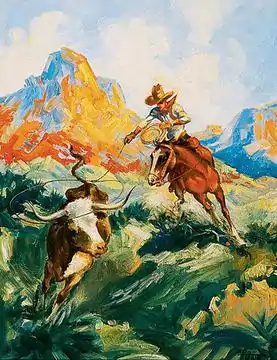In the fall of 1924, Harman got a wire from an artist friend, Sam McConnell, about an illustrating job at Artcrafts Engraving Company. He took the first train he could get to St. Joseph, home of the Pony Express. In addition to his work as a catalog illustrator for Artcrafts (for the Olathe Boot Company, among other catalogs), Harmon created promotional art, book illustrations and film costume designs commemorating the Pony Express, and bought canvas and paint to create his own paintings at home in his spare time. Artcrafts then was on the 5th floor of the Jenkins Music Building, and Fred met and married musician Lola Andrews, who worked on the first floor of the same building. The couple had a son on May 27, 1927, the day Lindbergh arrived in Paris. Harman did not have the money to pay the hospital bill for his son's birth, so his boss at Artcrafts, William Henry Guenther Sr., bought one of Harman's paintings (of a cowboy with red hair) for the exact amount needed to cover the bill. The couple later moved to St. Paul, Minnesota, where Fred was a partner in an advertising agency for several years before it failed. He was employed in Iowa for a short time before moving his wife and son to Pagosa Springs, where they built a log cabin. In 1933, he moved to Los Angeles, where he edited, illustrated and published a Western magazine that collapsed after three issues. Although the Stendahl Art Gallery staged a show of his paintings, none sold.[1][2]