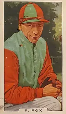 Frederick Sidney Fox (1888–12 December 1945), referred to in his retirement as "The Mayor of Wantage"[1] was a British horse racing jockey. He was a British Classic winner in his early twenties, but it was not until the last quarter of his thirty-year career that he had his greatest successes. He became the British flat racing Champion Jockey in 1930, making him one of only three jockeys to interrupt Gordon Richards' three decade run as champion and won two Derbies on Cameronian in 1931 and Bahram in 1935. He narrowly missed out on the British Triple Crown. He was ranked the 20th best jockey of the 20th century by Britain's industry paper, the Racing Post.[2]