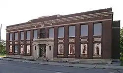 The Frederic M. Sibley Lumber Company Office Building was constructed in a Neo-Classical style in 1925.[6] The two-story building is red brick, trimmed with limestone, and the legend "F. M. Sibley Lumber Co." is carved in the limestone lintel above the entrance.[6] The façade is divided into eleven bays, each separated by a brick pillar.[5] Rectangular transoms within each bay separate the two stories.[5] Four limestone pilasters with Corinthian capitals surround the entrance, flanked by two vertical recessed lights.[2]