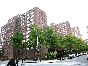 The development was approved by the New York City Planning Commission on February 7, 1952, as a low-rent housing project to be erected on a 22.5-acre (91,000 m2) site, a "superblock" bounded by Manhattan Avenue, Amsterdam Avenue and West 100th and 104th Streets.[4] The original portion of the complex consists of 17 buildings – 5, 9, 12, 17, 18, and 20 stories tall – completed on May 31, 1958 on a 21.76-acre (8.81 ha) site. The development includes 2,056 apartments housing some 4,588 residents. The Frederick Douglass Addition, completed on June 30, 1965, is a 16-story building with 306 residents on .55-acre (0.22 ha) on Amsterdam Avenue between West 102nd and West 103rd Streets.[3]