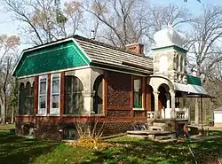The Frederick Francis Woodland Palace is a historic house located in Francis Park 2.5 miles (4.0 km) northeast of Kewanee, Illinois. Frederick Francis, a multi-talented architect, engineer, and artist, began work on the house in 1889; while he and his wife moved into the house a year later, he continued to work on it until his death in 1926. The house has an eclectic design noted both for its vernacular interpretation of Queen Anne and Romanesque Revival architecture and its innovative engineering. The building's exterior design includes a hand-chipped brick exterior, a concrete tower above the main entrance, two porches on the south side, a solarium on the west side, and a gambrel roof. The interior's noteworthy features include a bedroom designed like a Pullman sleeping car, a system of levers which opened both front doors at once, a hearth with a flue system that also helped heat the house, a water filtration and heating system supplied by a cistern, and several secret compartments.[2]