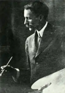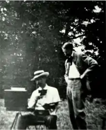 Takuma Kajiwara moved to St. Louis in 1905, "lured to the city partly by an offer of employment in a studio and even more by a desire to see the Mississippi River," according to his obituary in the St. Louis Star-Times.[2] Kajiwara and Sylvester were friends. According to one account, their amity was "warm enough to cause them to cut wrists and mingle blood in a gesture of unity." Sylvester designed a silver watch fob for Kajiwara showing an artist and a photographer clasping hands, and carrying, on the reverse side, the statement: "No East no West, But hand in hand, Life's Unity, To Understand, T. Kajiwara, from:, F.O. Sylvester, 1909." Kajiwara did photographic work for The Great River, a book by Sylvester collecting his paintings of the Mississippi, published in 1911. Photos show the men painting together.[1]