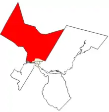 The riding of Fredericton-York in relation to other Fredericton electoral districts. The parts of the riding within Fredericton are gold, the balance of the riding is red.