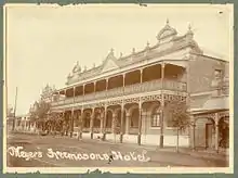 In 1890, builder H. Davey Jnr. purchased the hotel, later re-roofing and redecorating the premises and adding a billiard room. Davey also sold the water from the well to the hospital at a rate of half a crown a cask. In 1899 Davey built a single storey shop adjoining the hotel. In 1904, proprietor E.J. Myers extended the front to the street line and added a second storey. On 4 December 1908 the Freemasons' Hotel hosted a luncheon for the Governor of Western Australia, Frederick Bedford, when he was invited to commemorate the commencement of construction for the Newcastle–Bolgart Railway.[7]