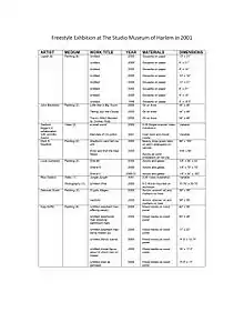 Freestyle was a contemporary art exhibition at The Studio Museum in Harlem from April 28-June 24, 2001 curated by Thelma Golden with the support of curatorial assistant Christine Y. Kim. Golden curated the works of 28 emerging black artists for the exhibition, characterizing the work as 'Post-Black'. The latter is a term she generated along with artist Glenn Ligon as a genre of art "that had ideological and chronological dimensions and repercussions. It was characterized by artists who were adamant about not being labeled as 'black' artists, though their work was steeped, in fact deeply interested, in redefining complex notions of blackness."[1] Freestyle was her first major project at The Studio Museum in Harlem and the first of an ongoing series of 'F' themed exhibitions including Frequency, Flow and Fore. The most recent iteration of the series was 2017's Fictions.
