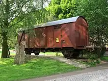 The standard designed covered freight wagons were intended by the Deutsche Reichsbahn for the transport of livestock and general cargo and are therefore sometimes referred to as "cattle wagons". They were mainly used in the East for the "transport of Jews" and thus became the "central symbol for the Nazi deportations."[2] However, the wagon on display is a wagon of the type Gms39 built in Czechoslovakia starting in 1948 for the Deutsche Bundesbahn.[3] In the deportation of German Jews, mostly old "third class" passenger wagons were used. The reports from Paul Salitter, who was in charge of the escort command of such a deportation train at the end of 1941, have been preserved.