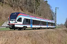Tenders were called for Regionalbahn services in the summer of 2006, which was won by a consortium consisting of Regentalbahn and Salzburg AG (a utility company largely owned by the state of Salzburg and the city of Salzburg) in October 2006. Operations are carried out under the brand name of Berchtesgadener Land Bahn (“Berchtesgadener Land Railway”, officially Berchtesgadener LandBahn GmbH, BLB, which was founded as a company on 4 May 2009) and commenced at the timetable change on 13 December 2009. Originally, it was intended that services would be operated from the start of the line by five three-carriage Stadler FLIRT railcars leased from Angel Trains Europa (now called Alpha Trains,[4] but operations were delayed until 24 and 25 February 2010, by a delay in the approval of the new railcars for the movement of passengers by the Federal Railway Authority (Eisenbahn-Bundesamt, EBA). Because BLB did not have its own rolling stock at first, services between Freilassing and Bad Reichenhall were operated using various borrowed replacement rail vehicles and a temporary replacement bus services was provided between Bad Reichenhall and Berchtesgaden. Berchtesgaden was again served by rail from 23 January 2010.[5] Following the granting of approvals by the EBA, services with FLIRT sets commenced on 24 and 25 February 2010. But on the following night of 26 February 2010, four parked FLIRT sets were damaged by vandalism in Freilassing and Berchtesgaden stations so badly that at first replacement rolling stock had to be used.[6] The FLIRT trains have operated on the line since 1 March 2010 and some services have continued across the border to Golling–Abtenau since 12 April 2010.