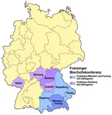 The Freising Bishops' Conference was founded in 1850. In it the bishops of the Archdiocese of Munich and Freising in southern Bavaria, with the suffragans of Regensburg, Passau and Augsburg as well as the Franconia Archdiocese of Bamberg with the suffragans of Würzburg, Eichstätt and Speyer are represented. The bishops of these dioceses meet since 1867 twice a year at the Freising cathedral hill, its leader, the Archbishop of Munich and Freising (since 2008 Archbishop Reinhard Marx); Substitute is the Metropolitan of the northern Bavarian ecclesiastical province of Bamberg (since 2002 Archbishop Ludwig Schick). The territory of the diocese of Speyer, although now part of the federal states of Rhineland-Palatinate and Saarland, the boundaries of the Province of Bamberg are unchanged since 1920/1945 - with the exception of the assignment of Thuringia areas of the diocese of Würzburg in the diocese of Erfurt - which is why the Palatinate canonically continues to be a part of Bavaria. The Freising Bishops' Conference has the mission to promote common pastoral duties to coordinate the church's work and provide a platform for mutual consultation. Unlike the German Bishops' Conference, supported by the Bavarian bishops in 1933, it has no decision making powers.
