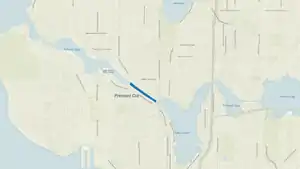 The Fremont Cut is a canal in Seattle, Washington, United States, that connects Lake Union to the east with Salmon Bay to the west. It is part of the Lake Washington Ship Canal linking Lake Washington to Puget Sound, and is 5,800 feet (1,800 m) long and 270 feet (82 m) wide. The center channel is 100 feet (30 m) wide and 30 feet (9.1 m) deep.