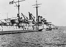 The following year, she became a gunnery training ship at Toulon,[4] but she suffered a serious boiler fire on 6 June 1923 that required repairs, so she was given the first of her modernisations between 9 July 1923 and 16 April 1924, at La Seyne-sur-Mer. This included replacing four boilers with oil-fired du Temple boilers and trunking together her two forward funnels. The maximum elevation of the main armament was increased from 12° to 23° which increased their maximum range to 26,000 metres (28,000 yd). Her existing AA guns were replaced with four 75 mm Modèle 1918 AA guns, and her bow armour was removed to make her more seaworthy. A new tripod foremast with a fire-control position at its top was fitted. A Barr & Stroud 4.57-metre (15 ft) rangefinder was positioned on the roof of the fire-control position and an experimental Barr & Stroud FX2 7.6-metre (24 ft 11 in) coincidence rangefinder was installed on the roof of the aft superfiring turret, replacing the 2-metre (6 ft 7 in) instrument inside the turret. She had another boiler fire on 1 August 1924, burning 13 men, of whom 3 later died of their wounds, and remained under repair for the rest of the year.[17]