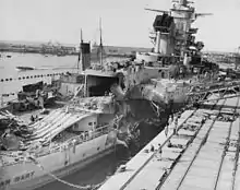 French forces in North Africa signed an armistice on 11 November,[23] prompting the Germans to invade the rest of Vichy France, which in turn led François Darlan, the former Chief of Staff of the French Navy, to defect to the Allies with the rest of the fleet. Repair work to make the ship seaworthy had already begun on 11 November, and by 15 February 1943, the outboard turbines were in service and manual steering controls had been repaired. Admiral Raymond Fenard, the head of the French naval mission to the US, requested that the US Navy take the ship to the United States to be repaired and completed, as they had begun to do with Richelieu. Fenard issued a report to the US Vice Chief of Naval Operations, Admiral Frederick J. Horne, on 15 April detailing the status of Jean Bart, but Horne replied on 1 May that the ship could not be completed to her original specifications. Five days later, the US Navy agreed that the ship would be taken to the United States in September, which necessitated repairs to the steering motors.[24][25]