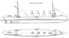 The ship's propulsion system consisted of three vertical triple-expansion steam engines driving three screw propellers. Steam was provided by fourteen coal-burning, Normand Sigaudy water-tube boilers. The boilers were divided into four boiler rooms, three groups of four and a fourth group of two. These were ducted into four funnels located amidships; the funnel number and arrangement was also selected to give her the appearance of a passenger liner. Her machinery was rated to produce 23,000 indicated horsepower (17,000 kW) for a top speed of 24 knots (44 km/h; 28 mph) Coal storage amounted to 1,960 long tons (1,990 t).[5][8] Her cruising range was 7,500 nautical miles (13,900 km; 8,600 mi) at a speed of 12 knots (22 km/h; 14 mph).[9] During her initial speed test, she only reached 23.12 knots (42.82 km/h; 26.61 mph) from 21,600 ihp (16,100 kW).[10]