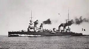 Jules Ferry was assigned to the Light Squadron (Escadre légère) of the Mediterranean Squadron upon her completion and she became the flagship of Vice Admiral (Vice-amiral) Jules François Joseph Krantz, the squadron commander. He remained in command until mid-1909 when he was relieved by Vice Admiral Louis-Joseph Pivet. On 5 October 1909, the French Navy reorganized its forces and redesignated the Mediterranean Squadron as the 1st Squadron (1er Escadre) and the Light Squadron became the 1st Light Division (1er Division légère (DL)). Jules Ferry was replaced as the 1st DL's flagship by Léon Gambetta by 4 April 1911 She had been transferred to the 2nd DL of the newly formed 2nd Squadron by 4 September when she temporarily served as the flagship of Vice Admiral Horace Jauréguiberry during the fleet review by Armand Fallières, President of France, and the Navy Minister, Théophile Delcassé, that day off Toulon.[7]