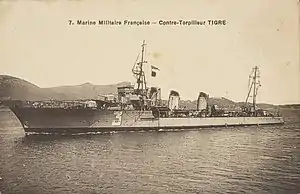 The French destroyer Tigre was a Chacal-class destroyer built for the French Navy during the 1920s. Aside from cruises to the English Channel and French West Africa, she spent her entire career in the Mediterranean Sea. The ship was assigned to the Torpedo School at Toulon in 1932 and remained there until World War II began in September 1939. She was then assigned convoy escort duties in the Atlantic; in July 1940, the ship was present when the British attacked the French ships at Mers-el-Kébir, but managed to escape without damage. After she reached Toulon, Tigre was placed in reserve where she remained for the next two years. When the Germans attempted to seize the French fleet there in November 1942, she was one of the few ships that was not scuttled and was captured virtually intact.