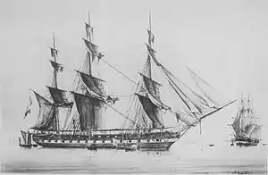 In 1836, under Captain Laplace, Artémise took part in an expedition to the Caribbean, along with Algésiras, and the next year circumnavigated the globe.[1] On 22 April 1839, she ran aground at Tahiti and was damaged. She was refloated with assistance from the American ship Champion. Repairs were estimated to need six months to complete.[3]