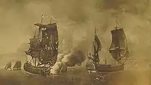 On the evening of 14 July 1780 Captain Sir James Wallace of the 64-gun ship of the line Nonsuch was off the Loire where her boats were burning the French frigate Legere.[3] He observed three vessels to the north west, signalling each other, and immediately gave chase. At about midnight Nonsuch caught up with one of the three off Île d'Yeu and commenced a two-hour action. When the French vessel struck her colours was identified as Belle Poule. She was armed with 32 12-pounder guns, had a crew of 275 men and was under the command of Chevalier Raymond-Marie, chevalier de Kergariou-Coatlès.[3][4] In the engagement Belle Poule lost 25 men killed, including Kergariou, and 50 other officers and men, including her second captain, wounded. Nonsuch had lost three men killed and 10 wounded, two of whom died later.[3] The two French vessels that escaped were the frigate Aimable, of 32 8-pounder guns, and the corvette Rossignol, of 20 6-pounder guns.[3]