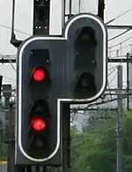 The flashing red aspect is a variant of the semaphore: a driver may pass the signal with caution at a speed which allows the train to stop at any obstruction, at a maximum speed of 15 km/h after the signal. |