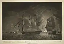 By the terms of the Third Treaty of San Ildefonso of October 1800, Spain agreed to supply France with "six ships of war in good condition built for seventy-four guns, armed and equipped and ready to receive French crews and supplies". The San Antonio was handed over in May 1801 to become the French ship Saint Antoine under Commodore Julien Le Ray, though some Spanish seamen remained aboard. Taking part in the Second Battle of Algeciras during the night of 12–13 July 1801, she was pursued by HMS Superb, Captain Keats, the combined French and Spanish crew engaging the British vessel as it approached.[1] At 23:50 on the 12th, Keats laid his ship close alongside the new French ship, beginning a close and heated action as the ships of the line exchanged broadsides with one another in pitch darkness and with an increasing wind.[2] For thirty minutes the battle continued until, with the ships off Cape Spartel in North Africa, a wounded Le Ray decided that his ship was no longer able to contest the action and hailed Superb to announce that he had surrendered. The halyards that held up his pennant had however become tangled in the rigging, giving the appearance that the ship was still in French hands: this later led Saint Antoine to be attacked repeatedly by other British ships as they came up during the night.[3] Keats remained with his prize, awaiting the arrival of the rest of the squadron: Caesar, Venerable, Spencer and Thames arrived after midnight, all firing on Saint Antoine as they passed before continuing westwards in search of other enemy vessels.
