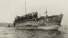 She was armed with four internal 45 cm (17.7 in) torpedo tubes in the bow and two Drzewiecki drop collars in the forecastle. Two reloads were stowed internally, which gave her a total of eight torpedoes.[5] During World War I, the boat probably used Modèle 1911V torpedoes. These had a 110-kilogram (240 lb) warhead and a range of 2,000 meters (2,200 yd) at a speed of 36 knots (67 km/h; 41 mph).[6]