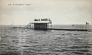The Émeraude class were built as part of the French Navy's 1903 building program to a Maugas single-hull design.[1] The submarines displaced 395 metric tons (389 long tons) surfaced and 427 metric tons (420 long tons) submerged. They had an overall length of 44.9 meters (147 ft 4 in), a beam of 3.9 meters (12 ft 10 in), and a draft of 3.8 meters (12 ft 6 in). They had an operational diving depth of 40 meters (130 ft). Their crew numbered 2 officers and 23 enlisted men.[2]
