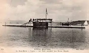 The boats were armed with four internal 450-millimeter (17.7 in) torpedo tubes, two in the bow and two in the stern, for which they carried six torpedoes.[4] Topaze and her sister Turquoise were the first French submarines to be equipped with a deck gun when they were fitted with a single 37-millimeter (1.5 in) gun in August 1915.[1]