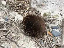 Echidnas (Tachyglossus aculeatus) can be seen during the day foraging through litter on forest floors, or among coastal vegetation, searching for ants or other food sources.[13] The eastern pygmy possum (Cercartetus nanus) and the little pygmy possum (Cercartetus lepidus) are listed as vulnerable in several mainland Australian states but are not listed in Tasmania, and although they can be found at Freycinet, sightings of them are uncommon.[14] The New Holland mouse (Pseudomys novaehollandiae) is listed as endangered under the Tasmanian TSP Act and sightings are rare, but it is known to be present within Freycinet National Park.[15]